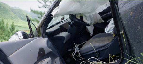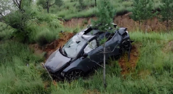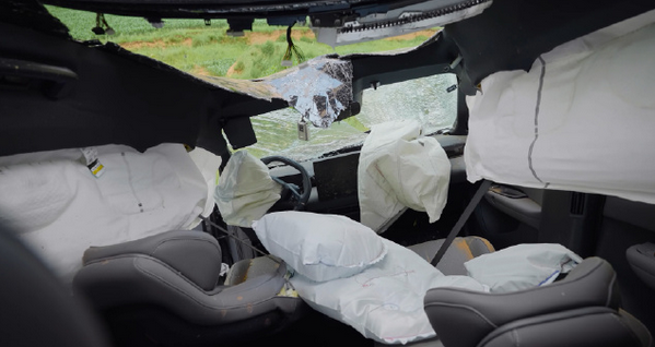 在如此极限的条件下,车辆坠地后电池瞬间下电,没有起火冒烟,另外车内没有车体侵入,乘员舱完整,生存空间得以保证,另外气囊全开,车门也可以正常打开。