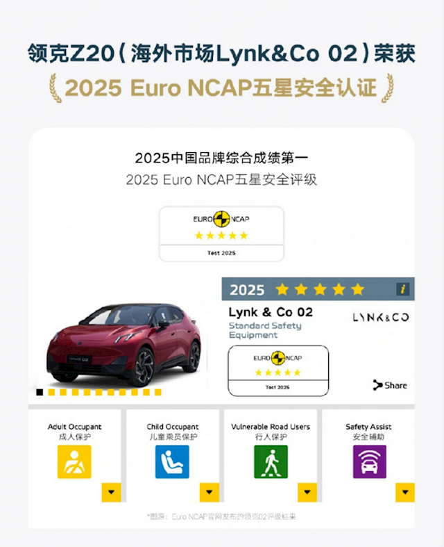 在此之前,领克Z20刚斩获欧洲Euro NCAP五星安全认证,以87.8%的综合得分拿下全球SUV安全得分第一。